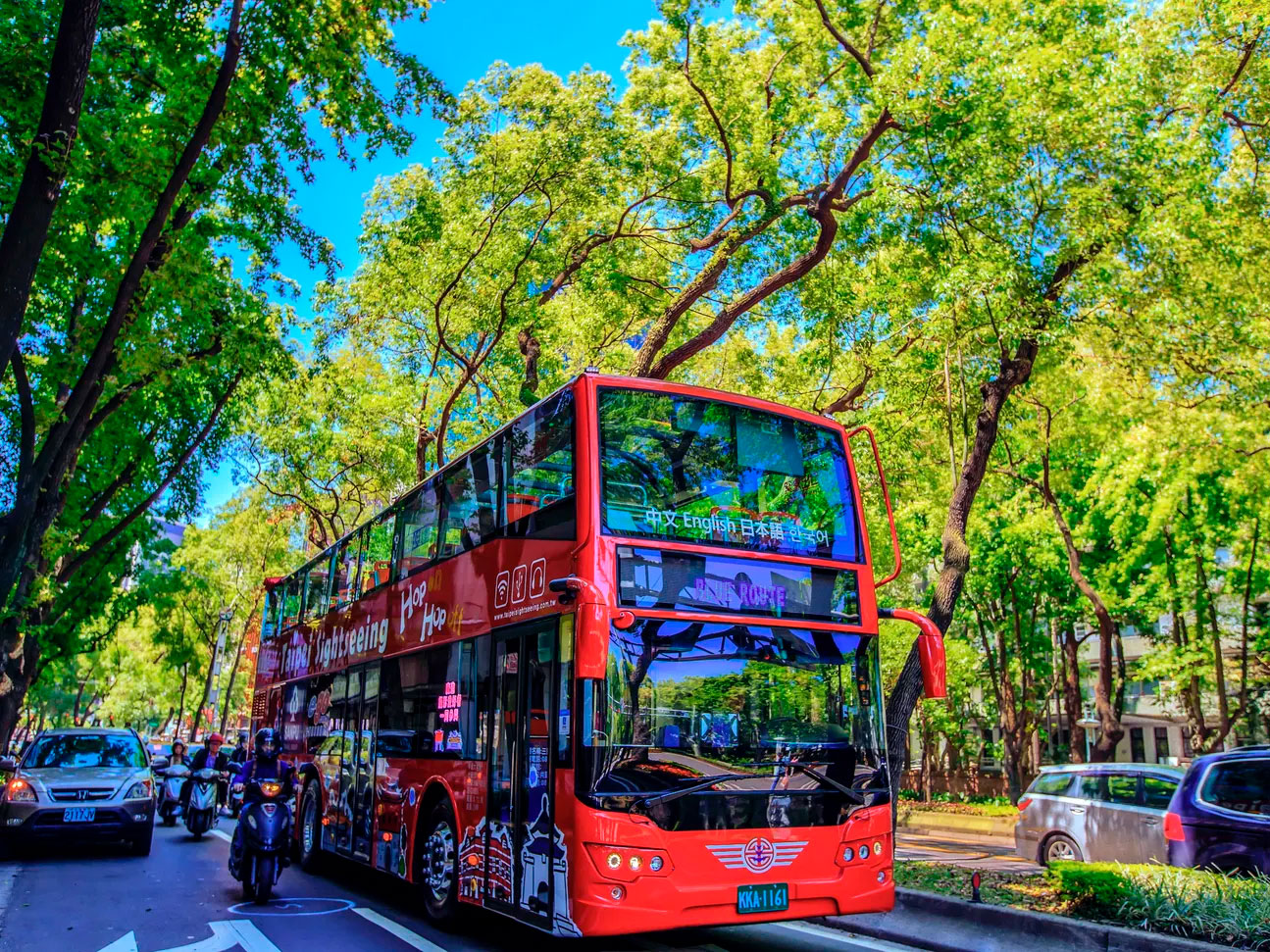 雙層觀光巴士,亮眼紅色車身搭配頂層半露天座位