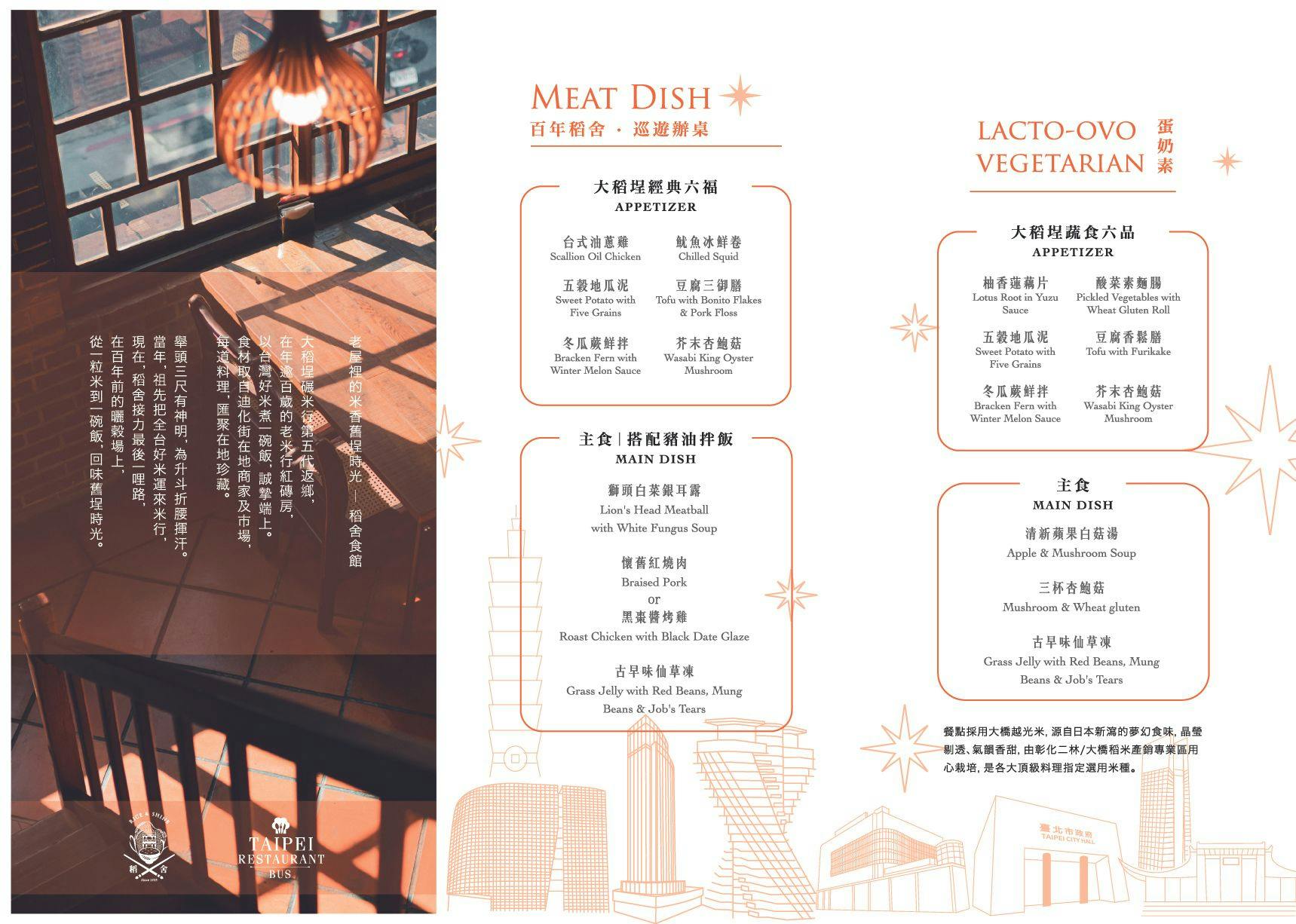 以台灣好米煮一碗飯,特選大橋越光一等米,晶瑩剔透、氣韻香甜,食材取自迪化街在地商家及市場,匯聚在地珍藏,每道料理手工製作,經典台菜配上新鮮米飯,再現台灣飲食風情,回味舊埕時光,誠摯端上。